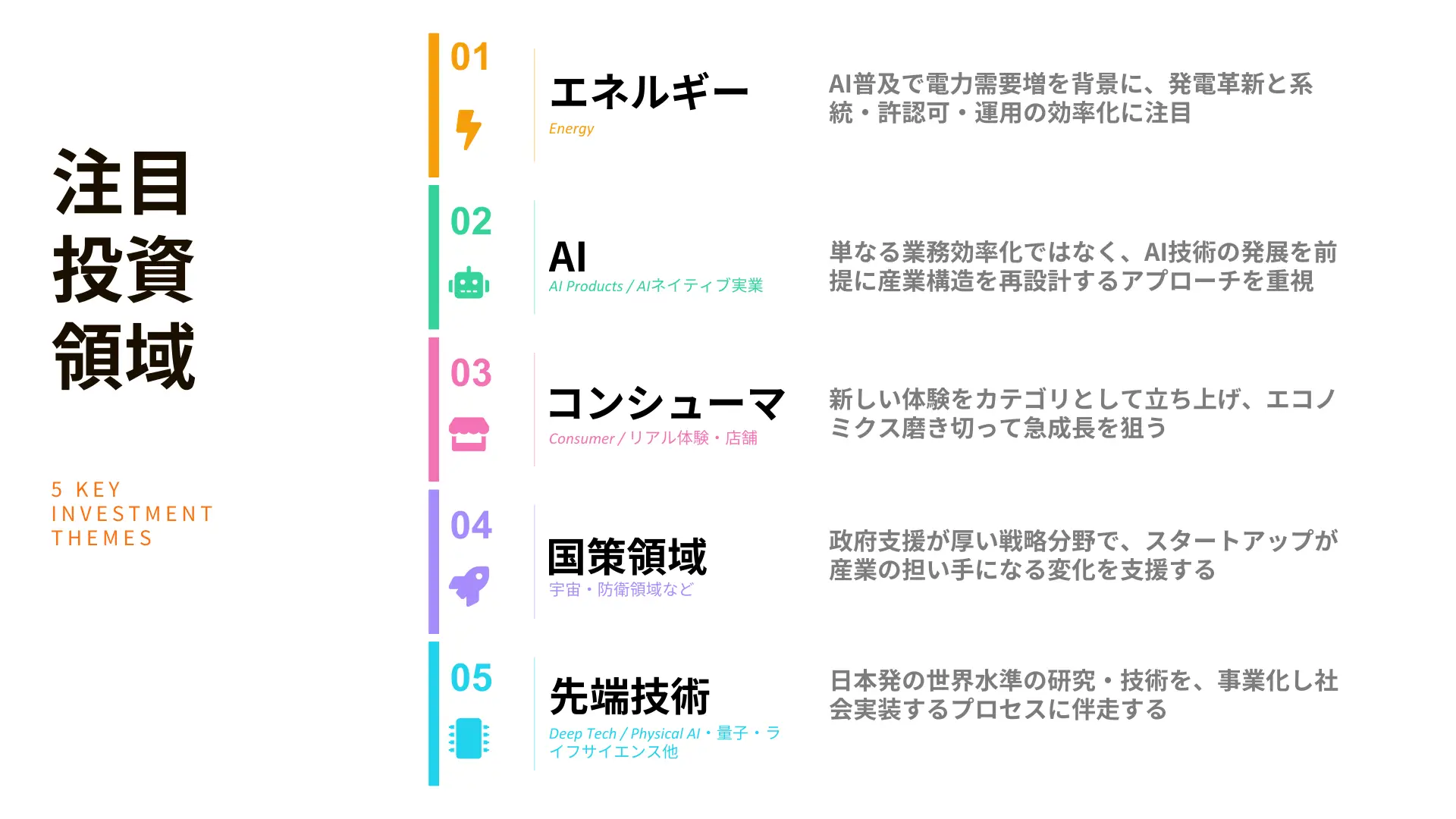 日本が研究開発および技術において世界をリードすると言われる先端技術領域、具体的にはPhysical AI・ロボティクス、量子・半導体、ライフサイエンスなどの領域について、研究・技術として確立されていてもビジネス用途や事業開発がまだ未完成な技術の発掘・社会実装に取り組んでまいります。