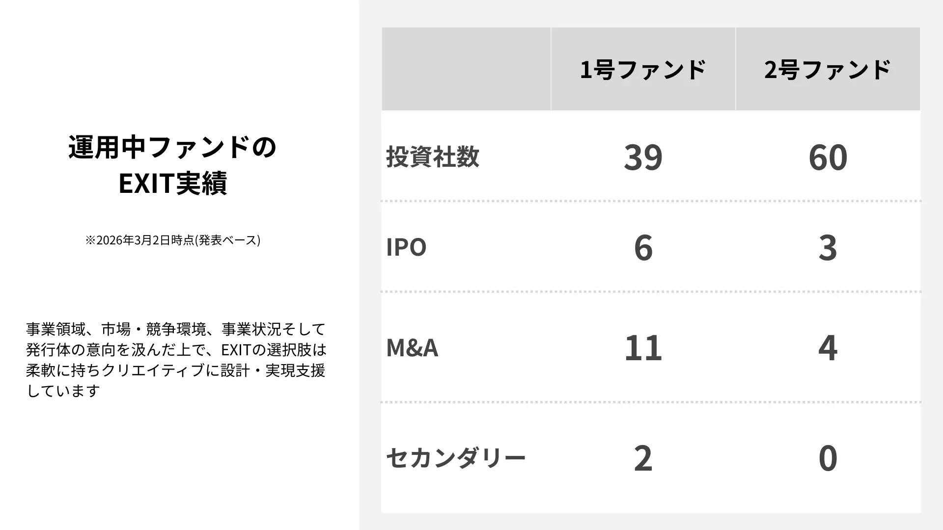 今後も未上場企業への投資を通じて事業価値、ひいては企業価値の最大化を支援しながら、当社ファンドとしての最適なEXITの形をスタートアップの皆様とともに組み立てていきます。